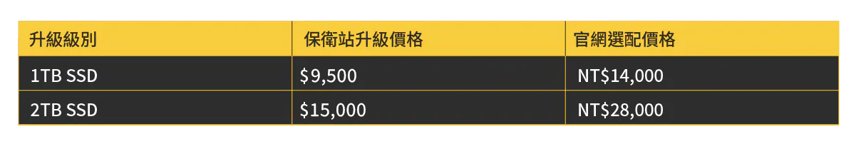 ① 升級 1TB SSD → 保衛站價格 NT$9,500(Apple 官網選配價格 NT$14,000)